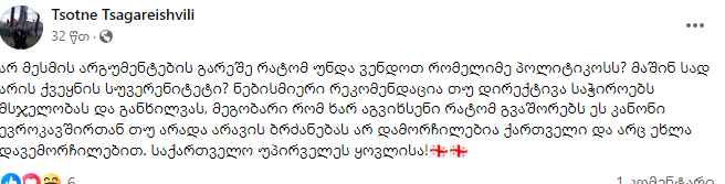 “არ მესმის, არგუმენტების გარეშე რატომ უნდა ვენდოთ რომელიმე პოლიტიკოსს? მაშინ სად არის ქვეყნის სუვერენიტეტი? ნებისმიერი რეკომენდაცია თუ დირექტივა საჭიროებს მსჯელობას და განხილვას, მეგობარი რომ ხარ აგვიხსენი რატომ გვაშორებს ეს კანონი ევროკავშირთან თუ არადა არავის ბრძანებას არ დამორჩილებია ქართველი და არც ახლა დავემორჩილებით. საქართველო უპირველეს ყოვლისა!”, – წერს ცოტნე ცაგარეიშვილი სოციალურ ქსელში.