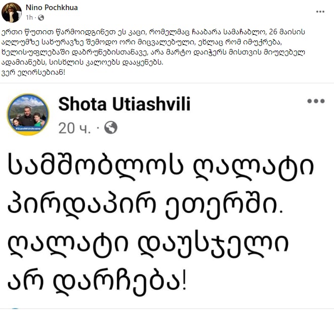 ნინო ფოჩხუა – შოთა უტიაშვილზე: ეს კაცი, რომელმაც ჩააბარა სამაჩაბლო და სახურავზე შემოდო ორი მიცვალებული, ახლაც იმუქრება, რომ არა მარტო დაიჭერს მისთვის მიუღებელ ადამიანებს, სისხლის კალოებს დააყენებს
