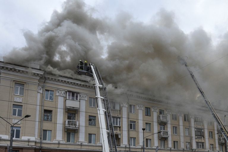 რაკეტა ხუთსართულიან სახლს მოხვდა, რომელსაც ხანძარი გაუჩნდა.