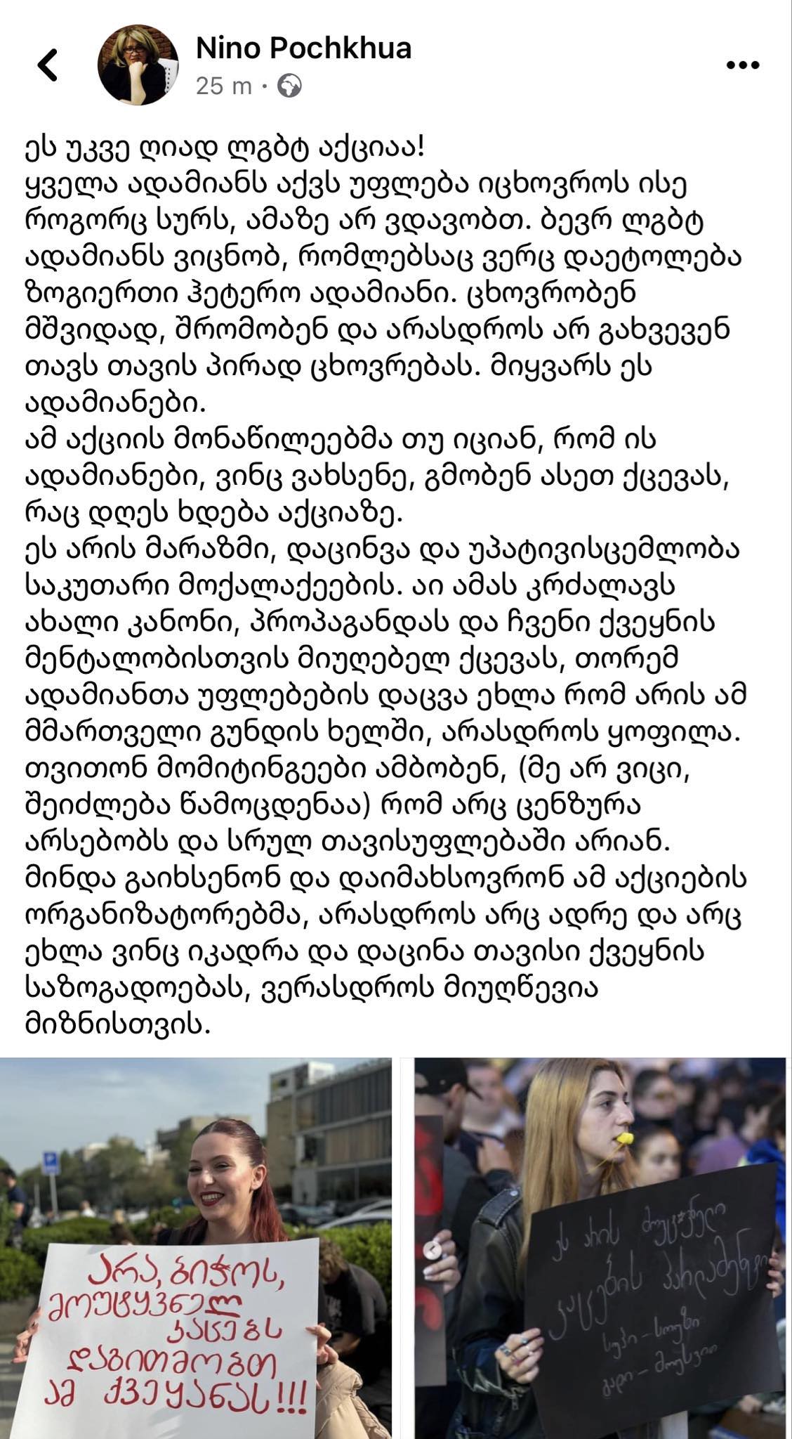 “ეს უკვე ღიად ლგბტ აქციაა! ყველა ადამიანს აქვს უფლება იცხოვროს ისე როგორც სურს, ამაზე არ ვდავობთ. ბევრ ლგბტ ადამიანს ვიცნობ, რომლებსაც ვერც დაეტოლება ზოგიერთი ჰეტერო ადამიანი. ცხოვრობენ მშვიდად, შრომობენ და არასდროს არ გახვევენ თავს თავის პირად ცხოვრებას. მიყვარს ეს ადამიანები. ამ აქციის მონაწილეებმა თუ იციან, რომ ის ადამიანები, ვინც ვახსენე, გმობენ ასეთ ქცევას, რაც დღეს ხდება აქციაზე. ეს არის მარაზმი, დაცინვა და უპატივისცემლობა საკუთარი მოქალაქეების. აი ამას კრძალავს ახალი კანონი, პროპაგანდას და ჩვენი ქვეყნის მენტალობისთვის მიუღებელ ქცევას, თორემ ადამიანთა უფლებების დაცვა ეხლა რომ არის ამ მმართველი გუნდის ხელში, არასდროს ყოფილა. თვითონ მომიტინგეები ამბობენ, (მე არ ვიცი, შეიძლება წამოცდენაა) რომ არც ცენზურა არსებობს და სრულ თავისუფლებაში არიან. მინდა გაიხსენონ და დაიმახსოვრონ ამ აქციების ორგანიზატორებმა, არასდროს არც ადრე და არც ეხლა ვინც იკადრა და დაცინა თავისი ქვეყნის საზოგადოებას, ვერასდროს მიუღწევია მიზნისთვის”, – წერს ნინო ფოჩხუა.
