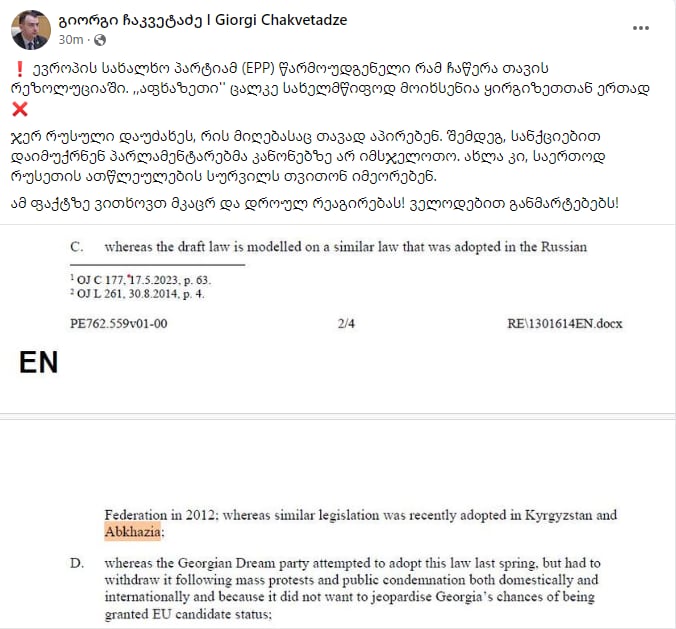 საპარლამენტო უმრავლესობის წევრი, გიორგი ჩაკვეტაძე, სოციალურ ქსელში ევროპის სახალხო პარტიის რეზოლუციიდან ამონარიდს აქვეყნებს, სადაც აფხაზეთი ცალკე სახელმწიფოდ არის მოხსენიებული.