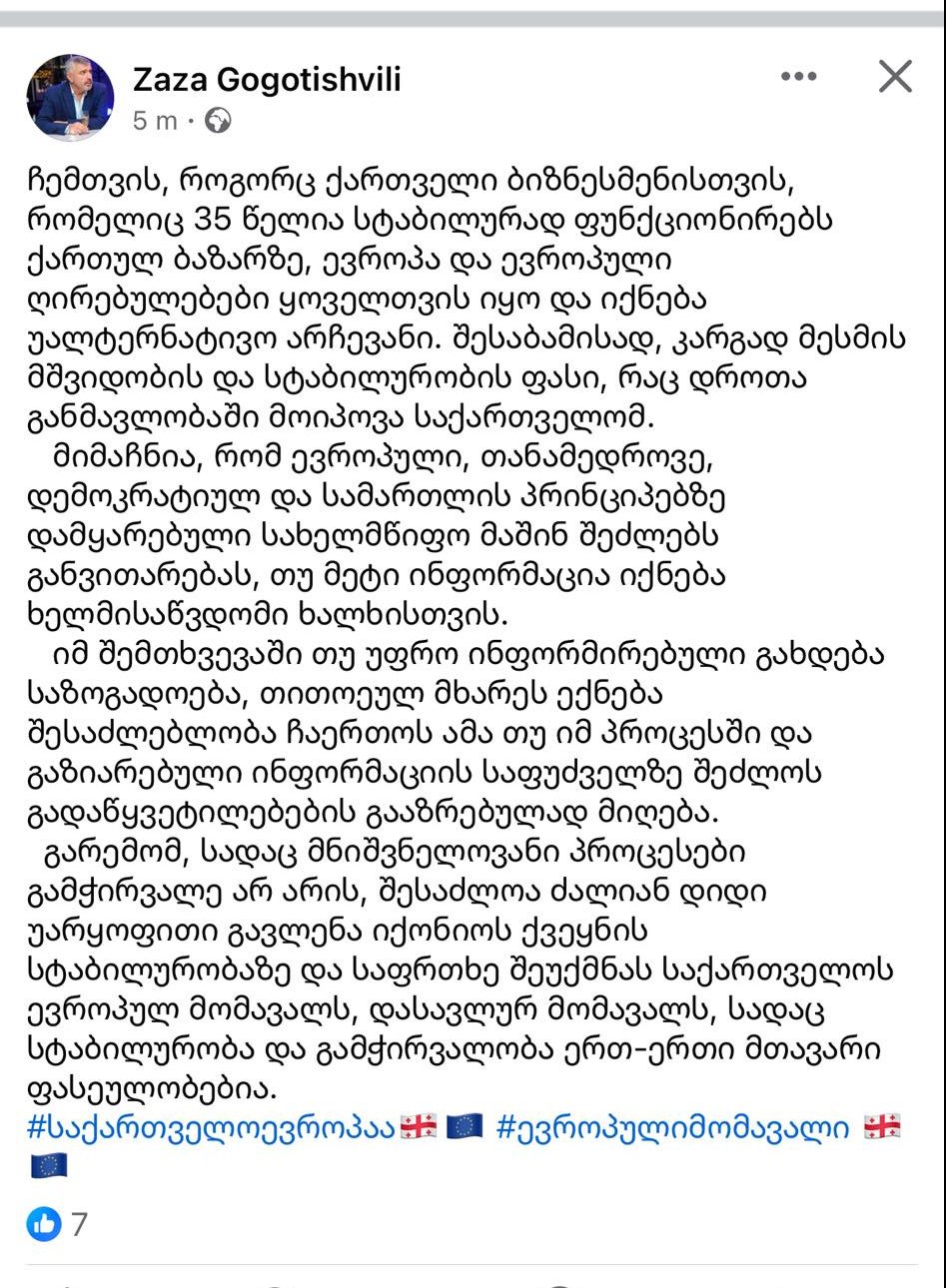 “ჩემთვის, როგორც ქართველი ბიზნესმენისთვის, რომელიც 35 წელია სტაბილურად ფუნქციონირებს ქართულ ბაზარზე, ევროპა და ევროპული ღირებულებები ყოველთვის იყო და იქნება უალტერნატივო არჩევანი”,- ამის შესახებ ბიზნესმენი, სამშენებლო კომპანია “ანაგის” დამფუძნებელი, ზაზა გოგოტიშვილი სოციალურ ქსელში წერს.