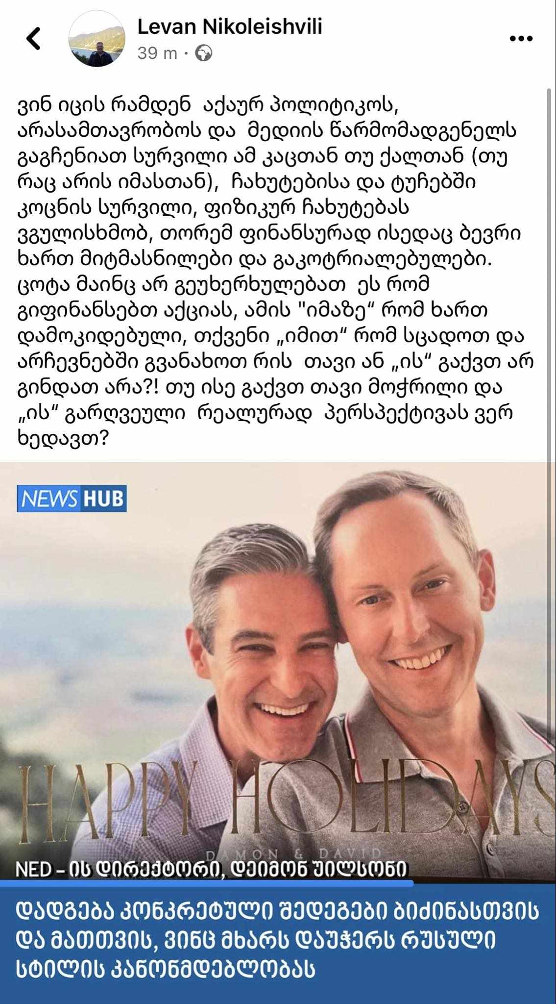 ლევან ნიკოლეიშვილი – NED-ის დირექტორზე: ვინ იცის, რამდენ აქაურ პოლიტიკოსს, არასამთავრობოს და მედიის წარმომადგენელს გაგჩენიათ ამ კაცთან თუ ქალთან ფიზიკური ჩახუტების სურვილი, ფინანსურად ისედაც ხართ მიტმასნილები – ცოტა მაინც არ გეუხერხულებათ, ეს რომ გიფინანსებთ აქციას?