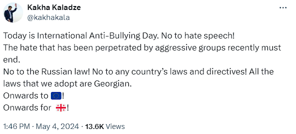 „დღეს ბულინგის წინააღმდეგ ბრძოლის საერთაშორისო დღეა. არა სიძულვილის ენას! აგრესიული ჯგუფების მიერ ბოლო დროს განხორციელებული სიძულვილი უნდა დასრულდეს. არა რუსულ კანონს! არა რომელიმე ქვეყნის კანონებსა და დირექტივებს! ყველა კანონი, რომელსაც ჩვენ ვიღებთ, არის ქართული. წინ ევროკავშირში! წინ საქართველოსთვის!“ – წერს კალაძე.