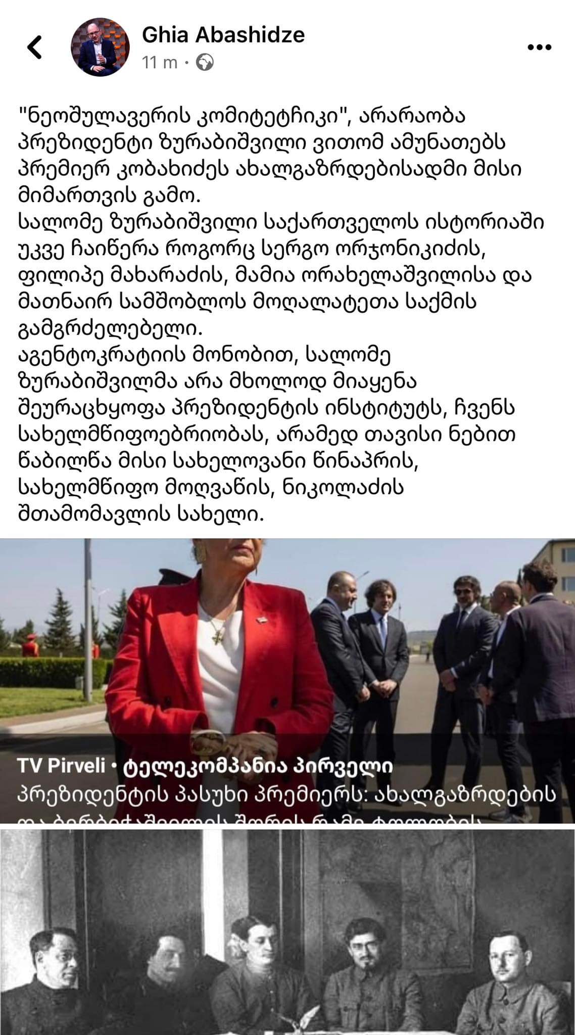 აგენტოკრატიის მონობით, სალომე ზურაბიშვილმა არა მხოლოდ მიაყენა შეურაცხყოფა პრეზიდენტის ინსტიტუტს, ჩვენს სახელმწიფოებრიობას, არამედ თავისი ნებით წაბილწა მისი სახელოვანი წინაპრის, სახელმწიფო მოღვაწის, ნიკოლაძის შთამომავლის სახელი”, – წერს აბაშიძე Facebook-ზე.