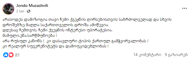 კი რეალურ სუვერენიტეტს და დამოუკიდებლობას!“ – წერს ჯონდო მუზაშვილი.