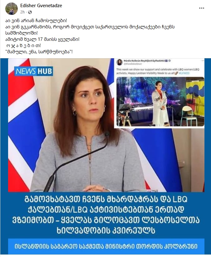 ექსპერტი, ედიშერ გვენეტაძე სოციალურ ქსელში ეხმიანება ისლანდიის საგარეო საქმეთა მინისტრის, თორდის კოლბრუნის მიერ ლესბოსელთა ხილვადობის კვირეულთან დაკავშირებით გაკეთებულ განცხადებას: „გამოვხატავთ ჩვენს მხარდაჭერას და LBQ ქალებთან/LBQ აქტივისტებთან ერთად ვზეიმობთ – ყველას გილოცავთ ლესბოსელთა ხილვადობის კვირეულს” – ისლანდიის საგარეო საქმეთა მინისტრი, თორდის კოლბრუნი”