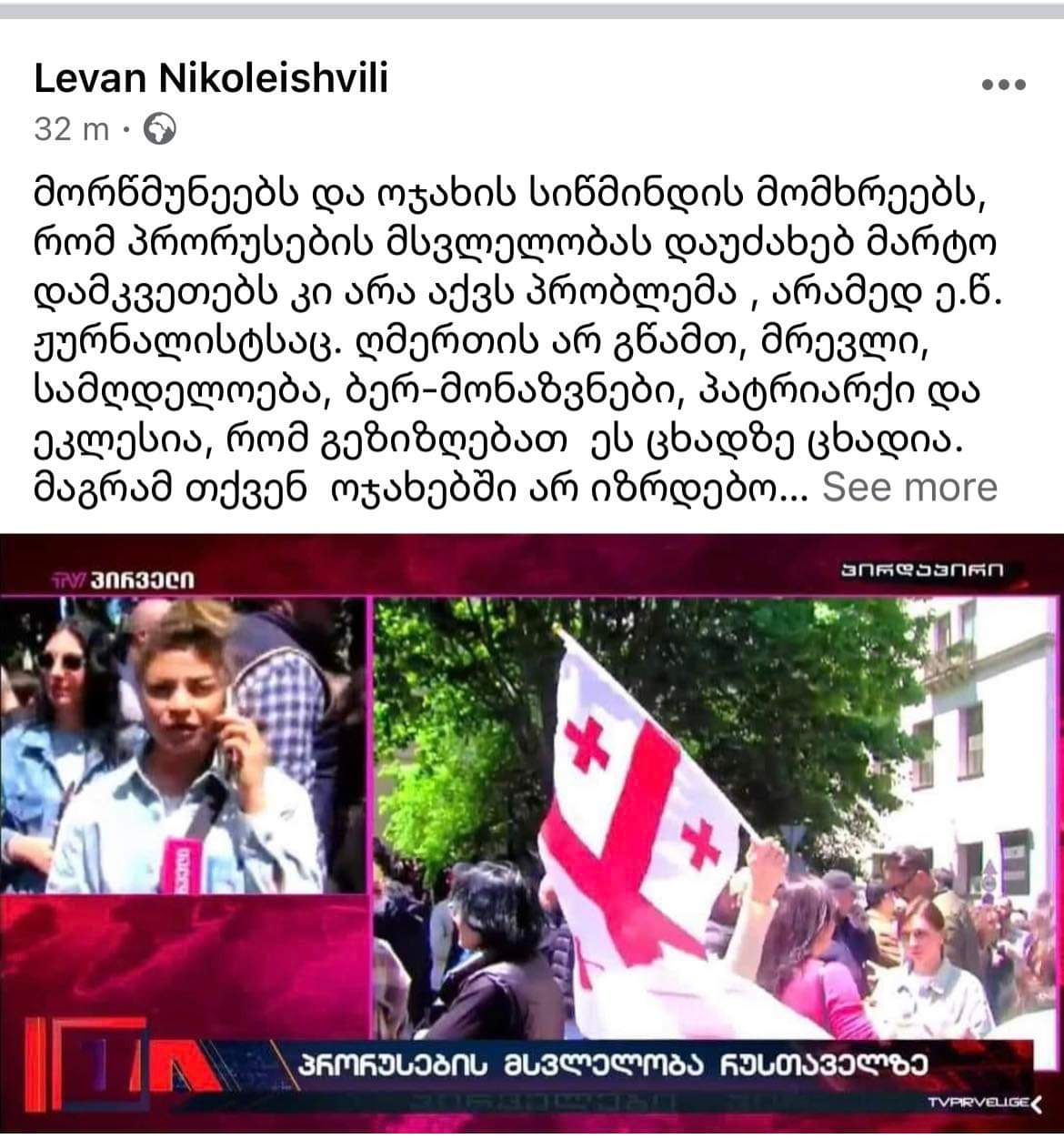 ლევან ნიკოლეიშვილი: ოჯახის სიწმინდის მომხრეებს რომ პრორუსების მსვლელობას დაუძახებ, მარტო დამკვეთებს კი არ აქვს პრობლემა, არამედ, ე.წ. ჟურნალისტსაც – მრევლი, სამღვდელოება და ეკლესია რომ გეზიზღებათ, ცხადია, მაგრამ თქვენ ოჯახებში არ იზრდებოდით?