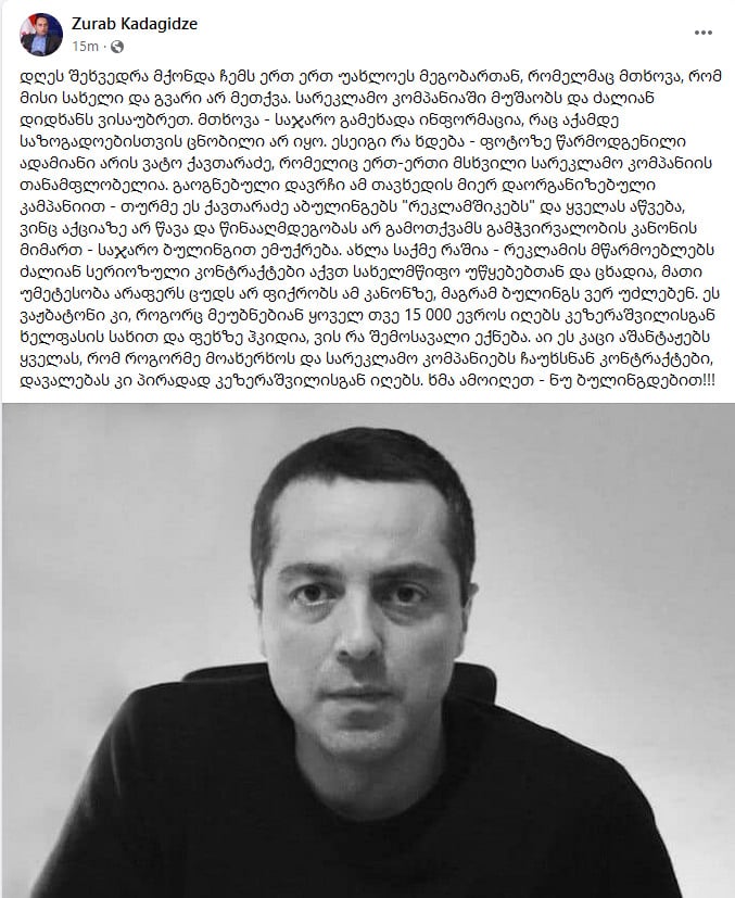„დღეს შეხვედრა მქონდა ჩემს ერთ ერთ უახლოეს მეგობართან, რომელმაც მთხოვა, რომ მისი სახელი და გვარი არ მეთქვა. სარეკლამო კომპანიაში მუშაობს და ძალიან დიდხანს ვისაუბრეთ. მთხოვა – საჯარო გამეხადა ინფორმაცია, რაც აქამდე საზოგადოებისთვის ცნობილი არ იყო. ესეიგი რა ხდება – ფოტოზე წარმოდგენილი ადამიანი არის ვატო ქავთარაძე, რომელიც ერთ-ერთი მსხვილი სარეკლამო კომპანიის თანამფლობელია. გაოგნებული დავრჩი ამ თავხედის მიერ დაორგანიზებული კამპანიით – თურმე ეს ქავთარაძე აბულინგებს “რეკლამშიკებს” და ყველას აწვება, ვინც აქციაზე არ წავა და წინააღმდეგობას არ გამოთქვამს გამჭვირვალობის კანონის მიმართ – საჯარო ბულინგით ემუქრება. ახლა საქმე რაშია – რეკლამის მწარმოებლებს ძალიან სერიოზული კონტრაქტები აქვთ სახელმწიფო უწყებებთან და ცხადია, მათი უმეტესობა არაფერს ცუდს არ ფიქრობს ამ კანონზე, მაგრამ ბულინგს ვერ უძლებენ. ეს ვაჟბატონი კი, როგორც მეუბნებიან ყოველ თვე 15 000 ევროს იღებს კეზერაშვილისგან ხელფასის სახით და ფეხზე ჰკიდია, ვის რა შემოსავალი ექნება. აი ეს კაცი აშანტაჟებს ყველას, რომ როგორმე მოახერხოს და სარეკლამო კომპანიებს ჩაუხსნან კონტრაქტები, დავალებას კი პირადად კეზერაშვილისგან იღებს. ხმა ამოიღეთ – ნუ ბულინგდებით!!!“- წერს ზურაბ ქადაგიძე.