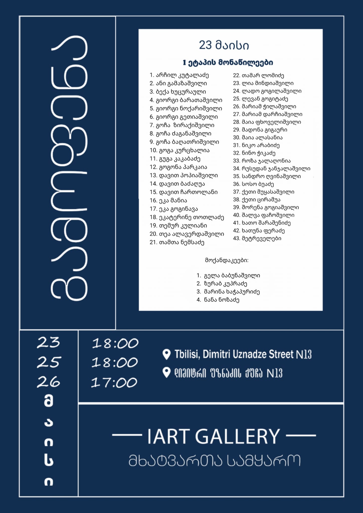23 მაისს, 18:00 საათზე, „იარტ გალერეაში” სოციალური ქსელის ჯგუფ „მხატვართა სამყაროში“ გაერთიანებულ თანამედროვე მხატვართა გამოფენა-გაყიდვა გაიმართება.