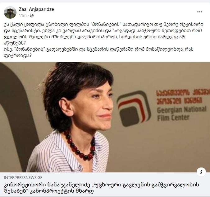 ექსპერტი, ზაალ ანჯაფარიძე სოციალურ ქსელში კინორეჟისორ ნანა ჯანელიძეს ეხმიანება, რომელმაც „უცხოური გავლენის გამჭვირვალობის შესახებ“ კანონპროექტის მხარდამჭერი დეპუტატების შვილებს ღია წერილით მიმართა და მოუწოდა, მშობლებს უთხრან, გაიწვიონ კანონი.