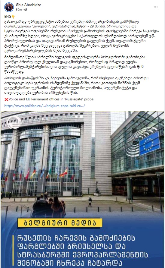 „გასაოცრად უპრეცედენტო ამბებია ვერცხლისმოყვარეობისგან გახრწნილ ფარისეველთა “კლუბში”, ევროპარლამენტში – 29 მაისს, ბრიუსელისა და სტრასბურგის ოფისებში რუსეთის ჩარევის გამოძიების ფარგლებში ჩხრეკა ჩატარდა. ეს იმ ფონზე ხდება, როცა ევროკრატები საქართველოს უსინდისოდ აბრალებენ ე.წ. პრორუსულობას და თავად არიან რუბლების გავლენის ქვეშ.“-ამის შესახებ ანალიტიკოსი გია აბაშიძე სოციალურ ქსელში წერს.