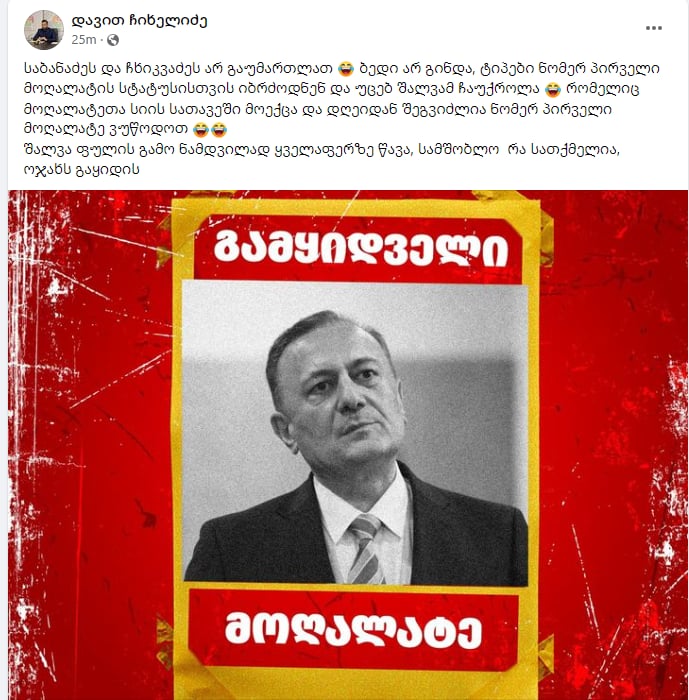 შალვა ფულის გამო ნამდვილად ყველაფერზე წავა, სამშობლო რა სათქმელია, ოჯახს გაყიდის”, – წერს დავით ჩიხელიძე.