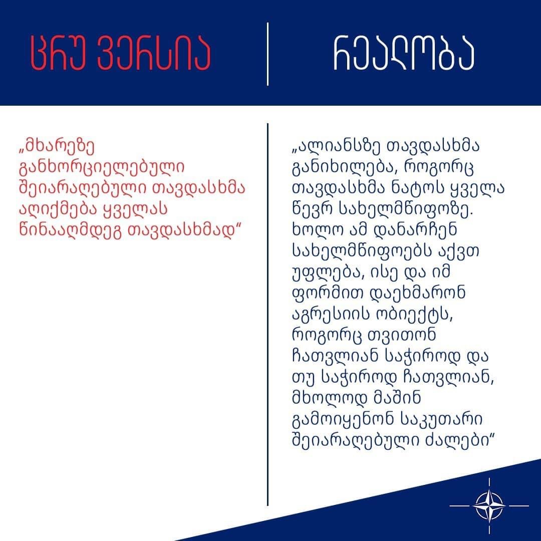 მისი განცხადებით, ალიანსის წესდების მე-5 მუხლის ქართულ თარგმანში, ამოღებულია ჩანაწერი, რომლის მიხედვითაც, ნატოს წევრ ერთ ქვეყანაზე თავდასხმა განიხილება როგორც თავდასხმა ყველა წევრზე, მაგრამ არანაირი სამხედრო მოქმედების ვალდებულებას არ აკისრებს ნატოს წევრ დანარჩენ სახელმწიფოებს.