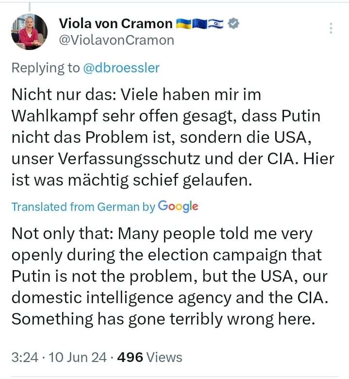 ცნობისთვის, გამოცემა “Politico”-ს ინფორმაციით, ევროკავშირის არჩევნებში პირველი ადგილი გერმანელ კონსერვატორებს ერგო, ულტრამემარჯვენე “ალტერნატივა გერმანიისთვის”(AfD) კი მეორე ადგილზე გავიდა. თავად ვიოლა ფონ კრამონის პარტია “მწვანეები” რომელიც ოლაფ შოლცის კოალიციაშია, არჩევნებში დამარცხდა.