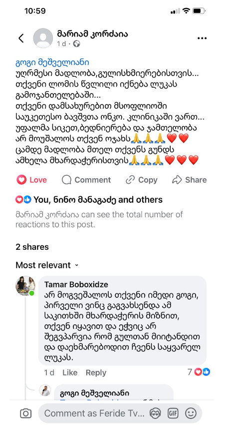 გოგი მეშველიანს მოქალაქე საჯაროდ მადლობას უხდის თანადგომისთვის – “თქვენი ლომის წვლილი იქნება ლუკას გამოჯანმრთელებაში”