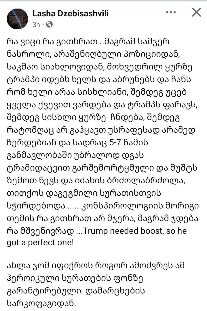 რა ვიცი, რა გითხრათ.. მაგრამ სამჯერ ნასროლი, არაშენიღბული პოზიციიდან, საკმაო სიახლოვიდან, მოხვედრილ ყურზე ტრამპი იდებს ხელს და აბრუნებს და ჩანს რომ ხელი არაა სისხლიანი, შემდეგ უცებ ყველა ქვევით ვარდება და ტრამპს ფარავს, შემდეგ სისხლი ყურზე ჩნდება, შემდეგ რატომღაც არ გაჰყავთ უსწრაფესად არამედ ჩერდებიან, ასე ეხმიანება სამოქალაქო მოძრაობის “აირჩიე ევროპა”ერთ-ერთი ლიდერი, ლაშა ძებისაშვილი დონალდ ტრამპზე განხორციელებულ თავდასხმას.