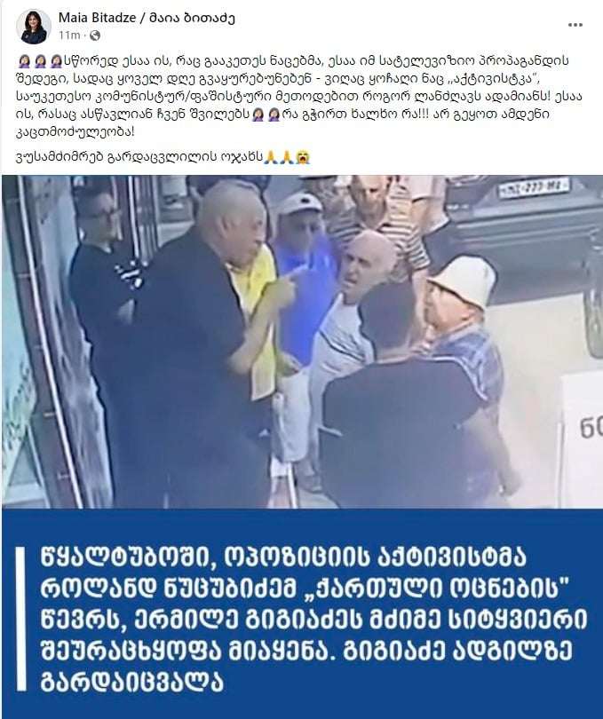 “სწორედ ესაა ის, რაც გააკეთეს ნაცებმა, ესაა იმ სატელევიზიო პროპაგანდის შედეგი, სადაც ყოველ დღე გვაყურებინებენ – ვიღაც ყოჩაღი ნაც ,,აქტივისტკა”, საუკეთესო კომუნისტურ/ფაშისტური მეთოდებით როგორ ლანძღავს ადამიანს! ესაა ის, რასაც ასწავლიან ჩვენ შვილებს. რა გჭირთ ხალხო რა!!! არ გეყოთ ამდენი კაცთმოძულეობა!