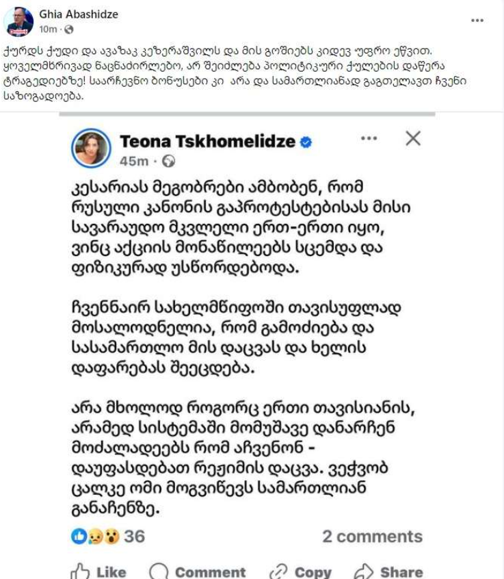 ანალიტიკოსი გია აბაშიძე, ოპოზიციონერი ჟურნალისტის, თეონა ცხომელიძის მიერ კესარია აბრამიძის მკვლელობის საქმეზე დაკავებული პირის შესახებ გავრცელებულ ინფორმაციას ეხმიანება.