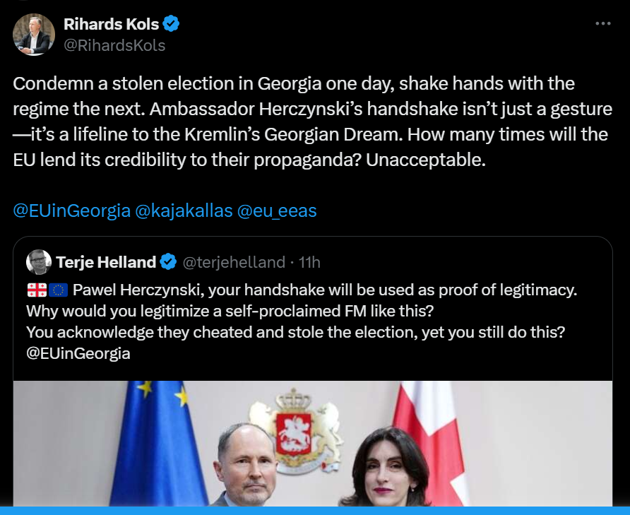 „ერთ დღეს საქართველოში მოპარულ არჩევნებს გმობთ, მეორე დღეს რეჟიმს ხელს ართმევთ. ელჩი ჰერჩინსკის ხელის ჩამორთმევა მხოლოდ ჟესტი არ არის – ეს არის კრემლის „ქართული ოცნების“ მაშველი რგოლი. რამდენჯერ მიანიჭებს ევროკავშირი მათ პროპაგანდას დამაჯერებლობას? მიუღებელია“, – დაწერა მან სოციალურ ქსელ X-ზე.