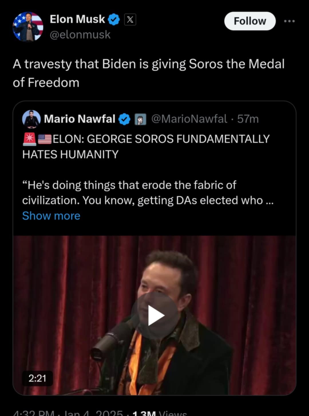 “აბსურდია, შეურაცხმყოფელია, დაცინვაა, სისულელეა, რომ ბაიდენი სოროსს თავისუფლების მედლით აჯილდოვებს”, – წერს მასკი x-ზე.