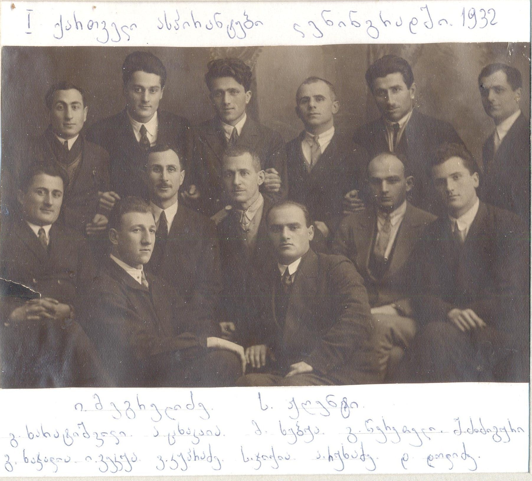 – ძალიან საინტერესოა ისტორიული მნიშვნელობის სურათი, რომელიც 1932 წლის 17 თებერვალს ლენინგრადშია გადაღებული. მასზე აღბეჭდილია პირველ ქართველ ასპირანტთა ჯგუფი, რომლებმაც შემდგომში ქართული მეცნიერება განავითარეს. ამ სურათს „30-იანი წლების თერგდალეულები“ ვუწოდე, რომლის დედანიც ჩემთან ინახება. მარცხნიდან მარჯვნივ პირველ რიგში: გ. ხარატიშვილი, ი. მეგრელიძე, ა. ცხაკაია, მ. ზუხბა, ს. ჟღენტი, გ. წერეთელი, შ. ძიძიგური.