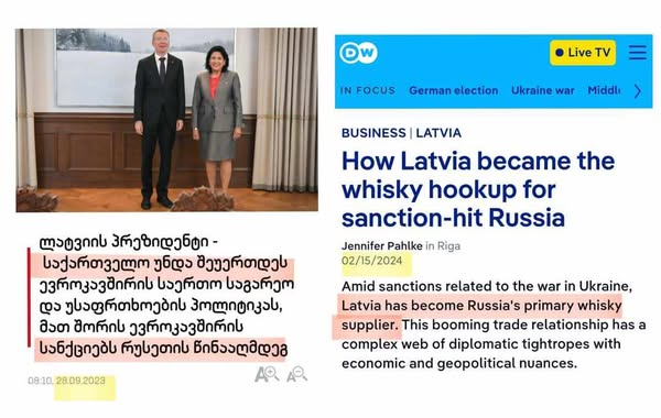 დღეს ჩვენ უკვე ვიცით, რომ, ომის პარალელურად, ლატვია რუსეთში ვისკის ყველაზე მსხვილი ექსპორტიორი გახდა, ისე, რომ ვისკის ერთ წვეთსაც არ აწარმოებს.