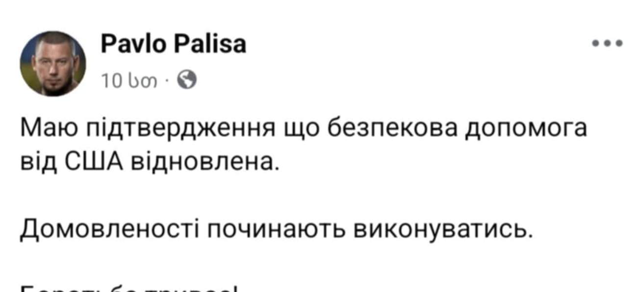 „მე მაქვს დადასტურებული ინფორმაცია, რომ აშშ-ის სამხედრო დახმარება აღდგენილია. შეთანხმების განხორციელება დაიწყო. ბრძოლა გრძელდება“, – წერს პალისა.