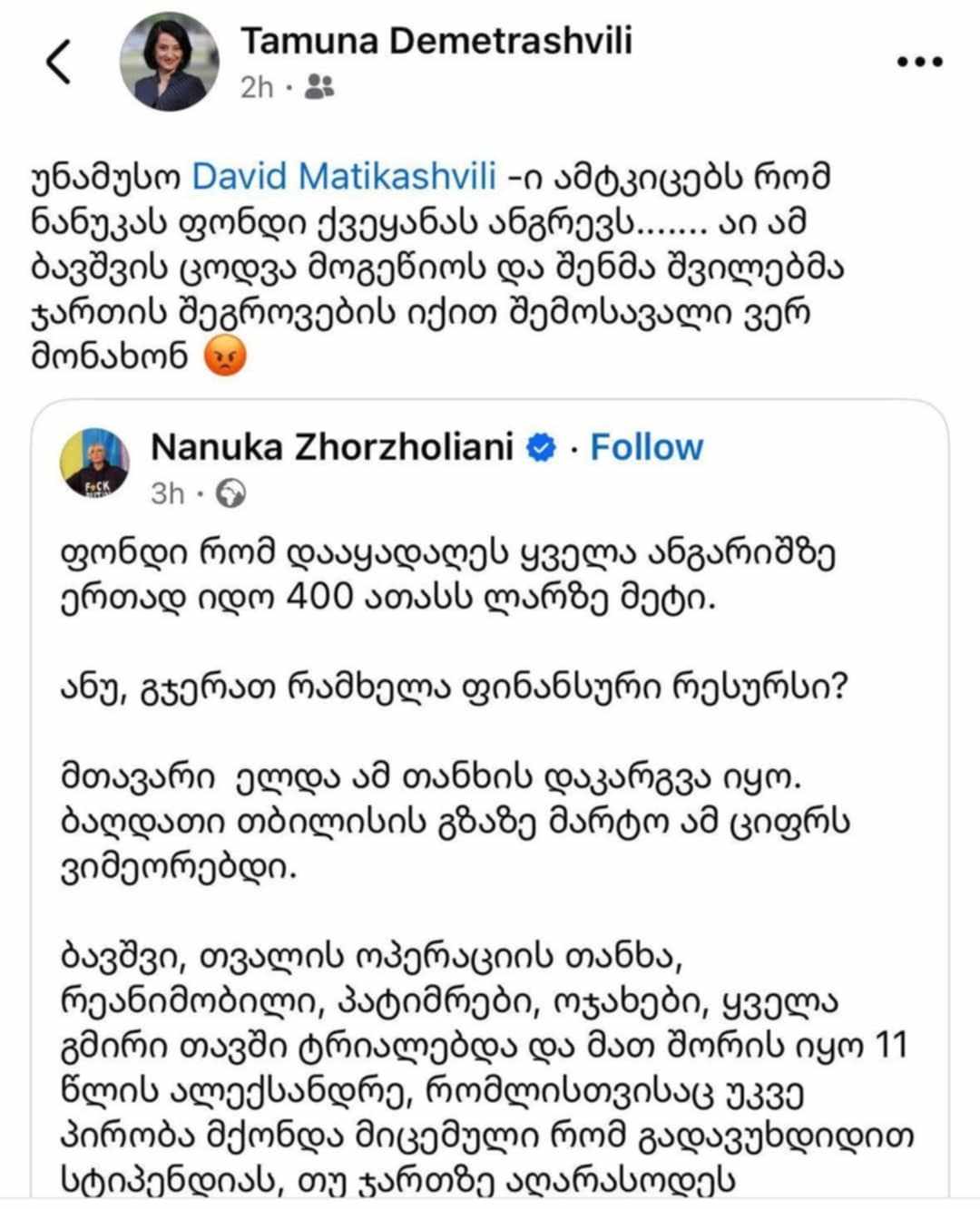 „ბავშვების პოლიტიკაში გარევა ხომ ცალკე, ფსკერის ისტორიაა, მაგრამ კიდევ უფრო მძიმეა, როცა დაგავალეს და ქალაქში ძალით გასვეცკებულ ნანა ჟორჟოლიანს იცავ“, – წერს „ხალხის ძალის“ წევრი თამთა მეგრელიშვილი „ფორმულას“ ჟურნალისტის თამუნა დემეტრაშვილის სტატუსის შესახებ, რომელიც „ქართული ოცნების“ დეპუტატის, დავით მათიკაშვილის მისამართით ამბობს, რომ მისმა შვილებმა „ჯართის შეგროვების იქით შემოსავალი ვერ მონახონ“.