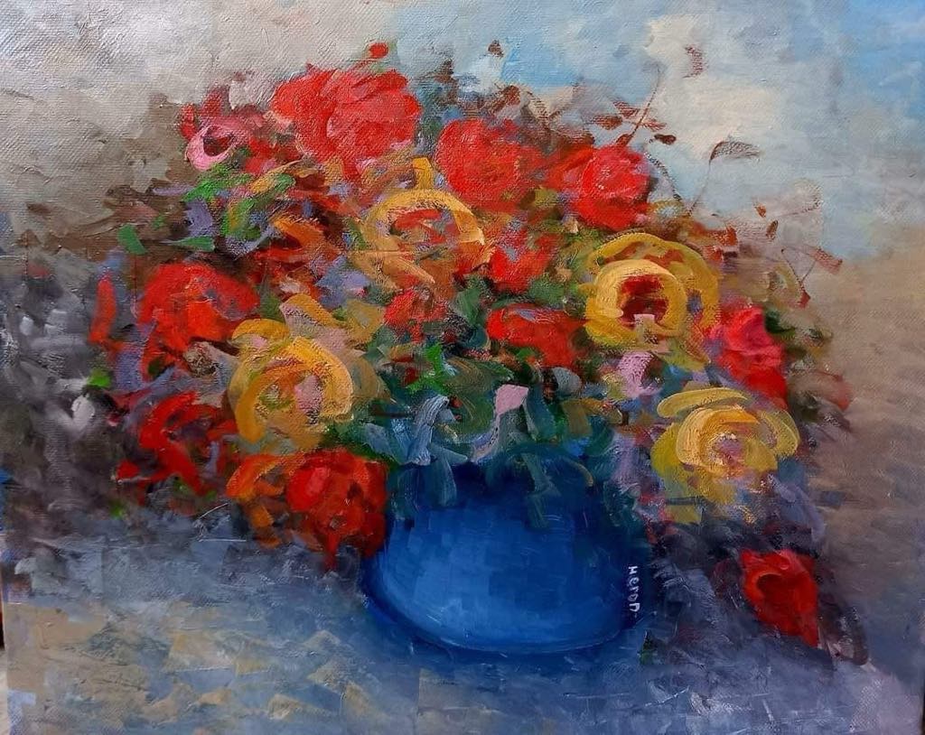 – საგამოფენო ნამუშევრებზე, თუმცა ბევრი მაქვს ჩემს სამალავში მტვერში შეყრილი. ჯერაც მზის შუქი არ უნახავთ. რაღაც ახალიც მინდა. მუშაობს გონება. ჯერ არა ფუნჯი აწყობს, ანაკუწებს, შლის, მერე ერთად კრავს. ისვრის ტილოზე, მაგრამ ხშირად, როცა ახალ ტილოს უკვე ფუნჯით ვიწყებ, მოდის ვინმე ახლობელი ან ახლობლის ახლობელი და უარს ვერ ვუბედავ… და ასე, საგამოფენო ნამუშევრები ხშირად მეცლება ხელიდან.