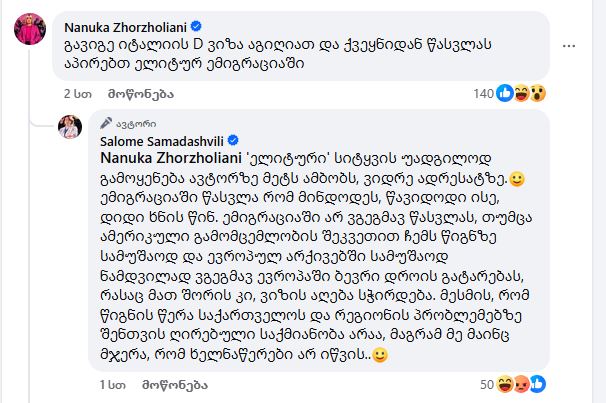 აღნიშნულის შესახებ ნანუკა ჟორჟოლიანმა სამადაშვილს პირად „ფეისბუქ“ გვერდზეც დაუწერა, რაზეც პოლიტიკოსმა უპასუხა: