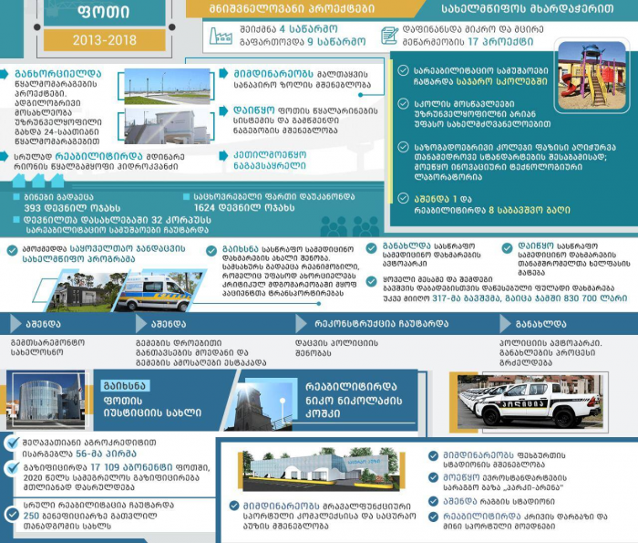 ” განხორციელდა წყალმომარაგების პროექტები. შედეგად ადგილობრივი მოსახლეობა უზრუნველყოფილი გახდა 24-საათიანი წყალმომარაგებით; სრულად რეაბილიტირდა მდინარე რიონის წყალგამყოფი ჰიდროკვანძი; დაიწყო ფოთის წყალარინების სისტემის და გამწმენდი ნაგებობის მშენებლობა;მიმდინარეობს მალთაყვის სანაპირო ზოლის მშენებლობა;კეთილმოეწყო ნაგავსაყრელი; შეიქმნა 4 და გაფართოვდა 9 საწარმო;დაფინანსდა მიკრო და მცირე მეწარმეობის 17 პროექტი; პროგრამის „აწარმოე საქართველოში“ ფარგლებში აშენდა კომპანია ,,აჭარა ტექსტილეს“ სამკერვალო ფაბრიკა. დასაქმდა 800 ადამიანი.; სარეაბილიტაციო სამუშაოები ჩატარდა საჯარო სკოლებში;სკოლის მოსწავლეები უზრუნველყოფილნი არიან უფასო სახელმძღვანელოებით; საზოგადოებრივი კოლეჯი ფაზისი აღიჭურვა თანამედროვე სტანდარტების შესაბამისად; მოეწყო ინოვაციური ტექნოლოგიური ლაბორატორია; აშენდა 1 და რეაბილიტირდა 8 საბავშვო ბაღი; ბინები გადაეცა 393 დევნილ ოჯახს; საცხოვრებელი ფართი დაუკანონდა 1624 დევნილ ოჯახს;დევნილთა დასახლებაში 32 კორპუსს სარეაბილიტაციო სამუშაოები ჩაუტარდა;ყველა მოქალაქისთვის სამედიცინო მომსახურების ხელმისაწვდომობის მიზნით ამოქმედდა საყოველთაო ჯანდაცვის სახელმწიფო პროგრამა; ფოთში გაიხსნა სასწრაფო სამედიცინო დახმარების ახალი შენობა, სამსახურს გადაეცა რეანიმობილი, რომელიც უფასოდ ახორციელებს კრიტიკულ მდგომარეობაში მყოფ პაციენტთა ტრანსპორტირებას; განახლდა სასწრაფო სამედიცინო დახმარების ავტოპარკი; დაიწყო სასწრაფო სამედიცინო დახმარების თანამშრომელთა ხელფასის მატება;ყოველი მესამე და შემდეგი ბავშვის დაბადებისთვის დაწესებული ფულადი დახმარება უკვე მიიღო 317-მა ბავშვმა, გაიცა ჯამში 830 700 ლარი; სრული რეაბილიტაცია ჩაუტარდა 250 ბენეფიციარზე გათვლილ თანადგომის სახლს;აშენდა გემთსარემონტო სახელოსნო; აშენდა გემების დროებითი განთავსების მოედანი და გემების ამოსაღები ესტაკადა;რეკონსტრუქცია ჩაუტარდა დაცვის პოლიციის შენობას; განახლდა პოლიციის ავტოპარკი. განახლების პროცესი გრძელდება;შეღავათიანი აგროკრედიტით ისარგებლა 56-მა პირმა; გაზიფიცირდა 17 109 აბონენტი ფოთში. 2020 წელს სამეგრელოს გაზიფიცირება მთლიანად დასრულდება; გაიხსნა ფოთის იუსტიციის სახლი; სრულად რეაბილიტირდა ნიკო ნიკოლაძის კოშკი; მიმდინარეობს მრავალფუნქციური სპორტული კომპლექსისა და საცურაო აუზის მშენებლობა;მიმდინარეობს ფეხბურთის სტადიონის მშენებლობა; მოეწყო ევროსტანდარტების სარაგბო ბაზა ,,პარკი-არენა”; აშენდა რაგბის სტადიონი;რეაბილიტირდა კრივის დარბ