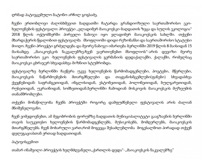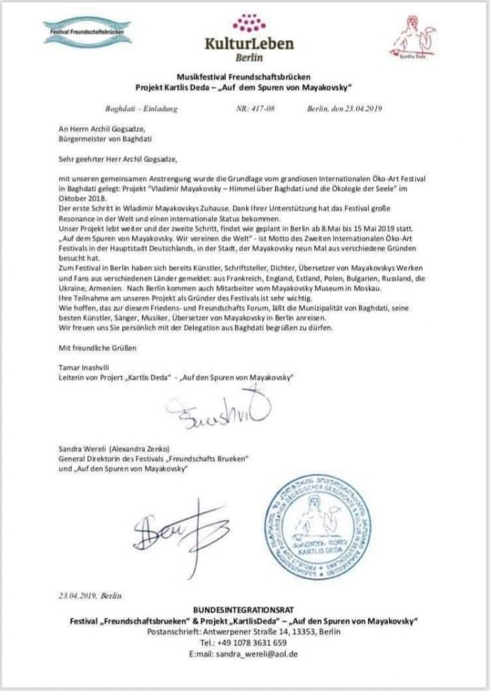 მერიის განმარტებით, აღნიშნულ ფესტივალს საფუძველი გასული წლის ოქტომბერში ბაღდათში ჩაეყარა, რომლის ერთ-ერთი დამფუძნებელი თავად ბაღდათის მერი, არჩილ გოგსაძეა. ამჯერად, ფესტივალის მეორე ეტაპი ქალაქ ბერლინში მიმდინარეობს.
