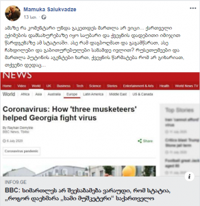 “ამაზე რა კომენტარი უნდა გაკეთდეს მართლა არ ვიცი… ქართველი ექიმების დამსახურებაზე იყო საუბარი და ქვეყნის დადებითი იმიჯით წარდგენაზე. ასე რამ დაგაბოღმათ და გაგამწარათ”,- ამის შესახებ ექსპერტი მამუკა სალუქვაძე სოციალურ ქსელში, “BBC”-ის პრესსამსახურის მიერ გავრცელებულ განცხადებასთან დაკავშირებით წერს, სადაც აღნიშნულია – “სიმართლეს არ შეესაბამება ვარაუდი, რომ სტატია სახელწოდებით, „როგორ დაეხმარა „სამი მუშკეტერი“ საქართველოს ვირუსის წინააღმდეგ ბრძოლაში“, შეკვეთილია”.