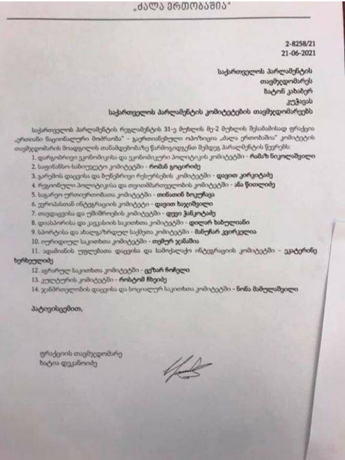 ექსპერტი, ლევან ნიკოლეიშვილი “ერთიანი ნაციონალური მოძრაობისა” და გაერთიანებული ოპოზიციის ,,ძალა ერთობაშია’’ მიერ პარლამენტის თავმჯდომარისთვის კომიტეტების მოადგილეების თანამდებობაზე წარდგენილ წევრების სიას ავრცელებს.