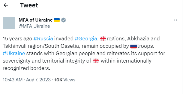 “15 წლის წინ რუსეთი საქართველოში შეიჭრა, მხარს ვუჭერთ ქვეყნის სუვერენიტეტს და ტერიტორიულ მთლიანობას” – უკრაინის საგარეო უწყება