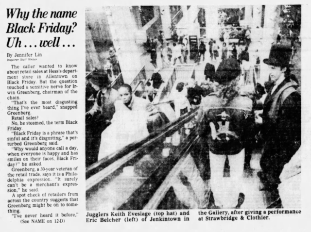 საცალო ვაჭრობასთან მას აკავშირებს ამერიკელი მეწარმეების ორფერიანი ბუღალტერიის წარმოება: ზარალი აღინიშნებოდა წითელ ფერად, ხოლო შემოსავალი შავად. როგორც ჩანს, მადლიერების დღის მერე მასობრივი გაყიდვებს კარგი შემოსავალი მოჰქონდა და საბუღალტრო ჩანაწერები სულ შავი იყო. ასეა თუ ისე, შავი ფერი ნოემბრის ბოლო პარასკევს 1980-იან წლებში შეერწყა და კონსუმერიზმის განუყრელი ნაწილიც გახდა.
