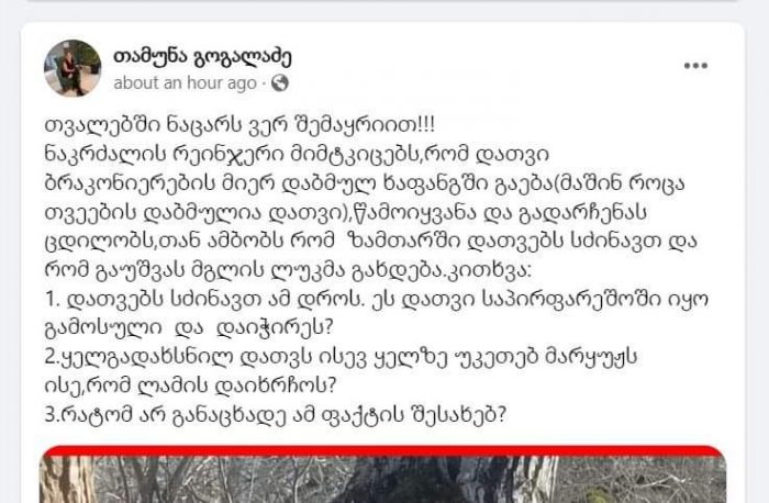 მანამდე, მოქალაქე თამუნა გოგალაძე სოციალურ ქსელში წერდა, რომ დათვი ტყეში ჯაჭვით იყო დაბმული.
