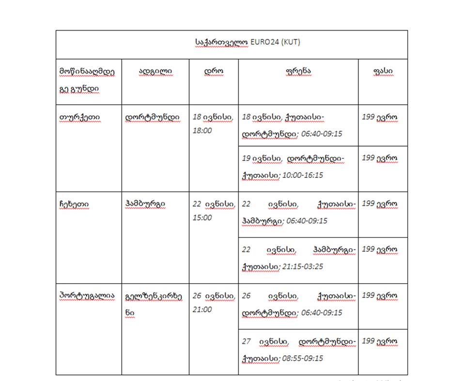 ავიაკომპანიის ინფორმაციით, 18, 22 და 26 ივნისს ქუთაისიდან გერმანიის, ხოლო 19, 22 და 27 ივნისს გერმანიიდან ქუთაისის მიმართულებით დამატებითი რეისები დაინიშნა.
