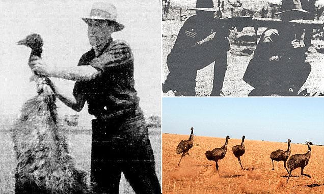 ჰოდა, 1932 წლის ბოლოს ველური ბუნების წინააღმდეგ წარუმატებელი სამხედრო ოპერაცია დაიწყო. ოპერაციის მიზანი საზოგადოებრივი შეშფოთების შემცირება გახლდათ, რომელიც კამპიონში, დასავლეთ ავსტრალიაში ემუს რაოდენობის ზრდით იყო გამოწვეული. ემუს პოპულაციის შემცირების წარუმატებელ მცდელობას, რომელიც ავსტრალიის მკვიდრი მსხვილი ფრინველია, იარაღით აღჭურვილი ჯარისკაცები ცდილობდნენ. შედეგად, მედიაში ამ ოპერაციას „ემუს ომი“ ეწოდა. მიუხედავად იმისა, რომ ოპერაციის შედეგად გარკვეული რაოდენობის ფრინველი დაიღუპა, ემუს პოპულაცია შენარჩუნდა და ავსტრალიელი ფერმერების მოსავლის განადგურება განაგრძო.
